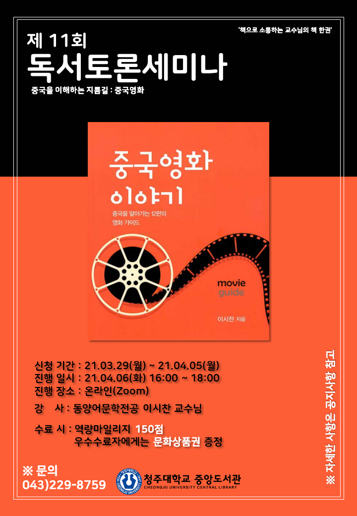 이번 세미나는 동양어문학전공 이시찬 교수님과 함께하는 '중국을 이해하는 지름길 : 중국영화'를 주제로 진행됩니다.